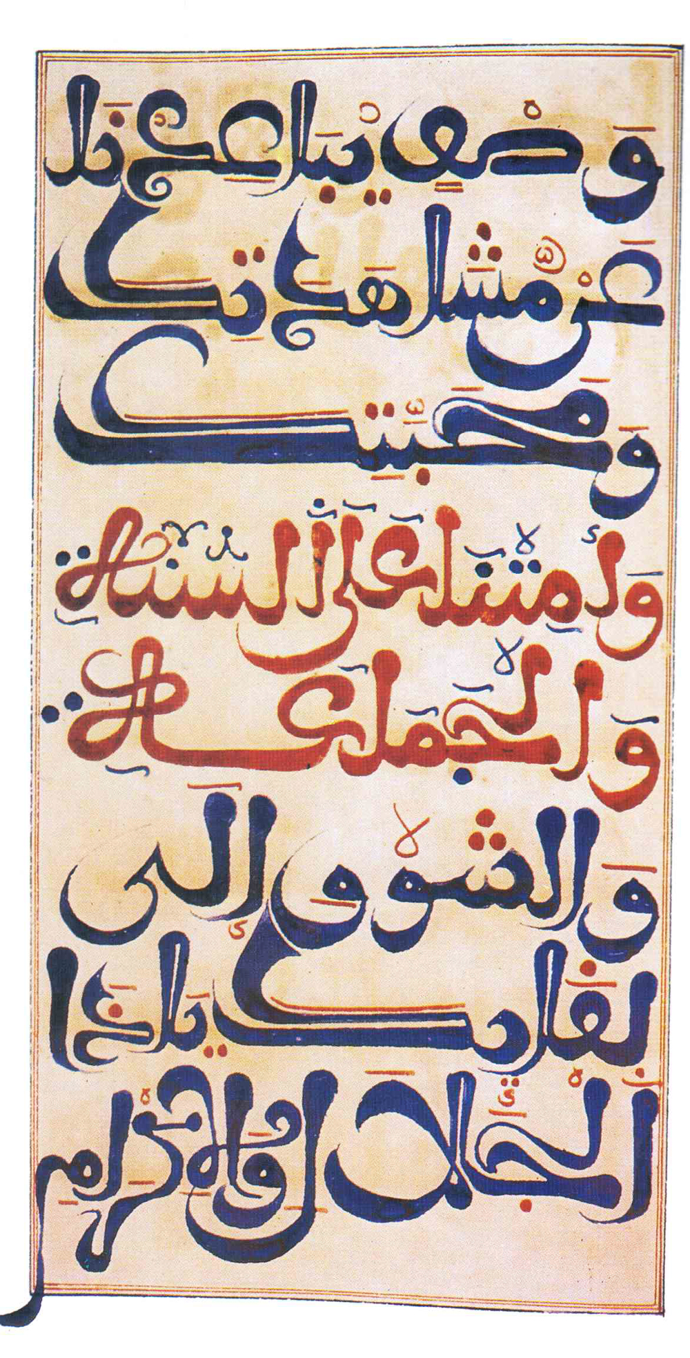 خط مغربی/ صفحه ای به خط القندوسی، رنگ های مورد استفاده برای بخش مرکزی، صامت ها و مصوت ها و علایم تشخیص برعکس است/ صفحه 63 کتاب