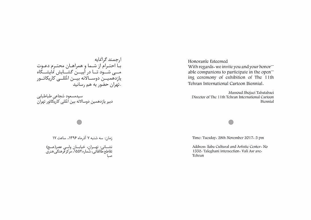 روز سه شنبه ۷ آذر ۱۳۹۶ نمایشگاه یازدهمین دوسالانه بین المللی کاریکاتور تهران در گالری های آیینه، خیال و خیال شرقی مرکز فرهنگی هنری صبا گشایش می باید.