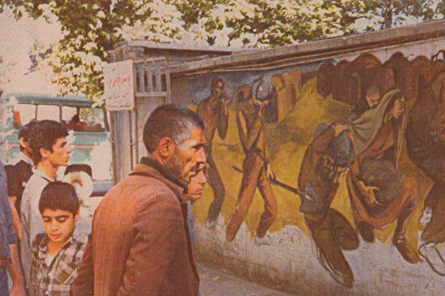 ج: یکی از این نقاشیها را روی دیوار دانشکده هنرهای زیبا به همراه مسعود سعدالدین و الخاص کشیدیم. یک نقاشیدیواری بزرگی بود که بعداً آن را پاک کردند. در آن دوره انجمنهای کارگری هم وجود داشت که در روز کارگر ما به آنجا میرفتیم و بر در و دیوارش نقاشی میکردیم. ولی خیلی نمیماند و میآمدند پاک میکردند. یکی هم در کوچهی دربند عزیزی بود که محل زندگی خودم بود؛ نقاشیای کشیدم که عکسهایی از آن باقی مانده. در این عکسها، مردمی ایستادهاند و مشغول تماشای دیوارِ نقاشیشده هستند. انگار آدمهای نقاشی از دل تصویر بیرون آمدهاند و دارند خودشان را تماشا میکنند.