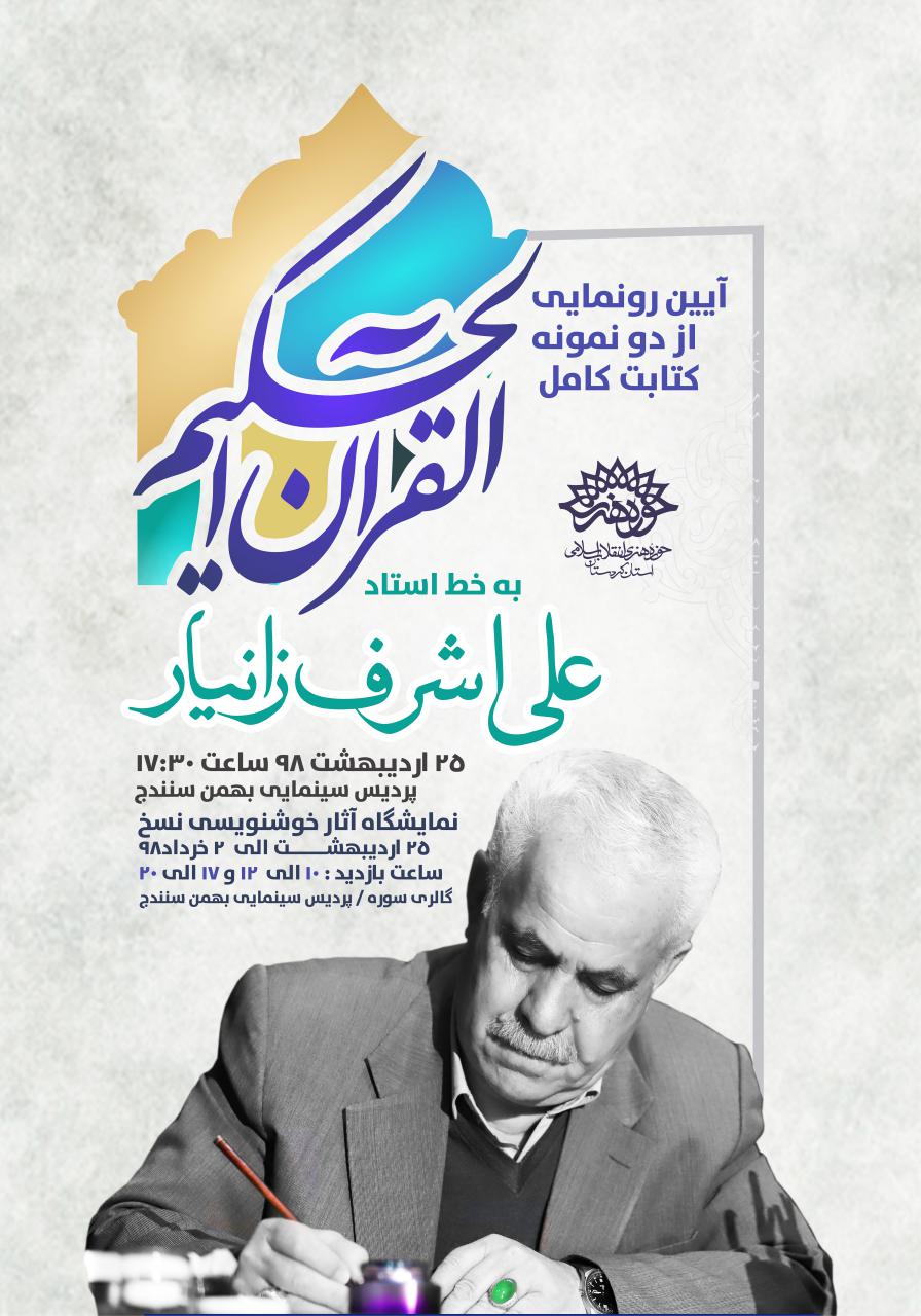 مرادی تصریح نمود : در استان کردستان نیز با توجه به دین مداری مردمان کرد کتابت آیات قرآنی و احادیث و توسط خوشنویسان استان به صورت عام وجود داشته و تمامی خوش نویسان بخش اعظمی از آثار خود را در نگارش آیات قرآنی قرار داده اند و بسیاری نیز به صورت جد کتابت کامل قرآن را به انجام رسانده اند که استاد علی اشرف زانیار از اساتید خط نسخ در این زمینه فعالیت های گسترده ای را داشته اند .