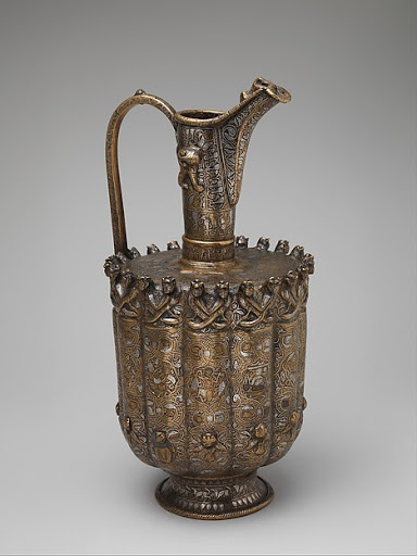 ابریق، هنر فلزکاری دوره سلجوقی/ از هرات/ 1180-1210 م/ ساخته شده از برنج با حکاکی برجسته و منبت کاری شده با نقره/ محل نگهداری: موزه بریتانیا، لندن/ صفخه 125